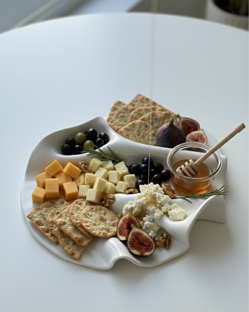 Hand-built in stoneware and finished with a food-safe glaze, Kyma is ideal as a charcuterie board or cheese platter, as well as for serving fruit, sweets, or small bites.